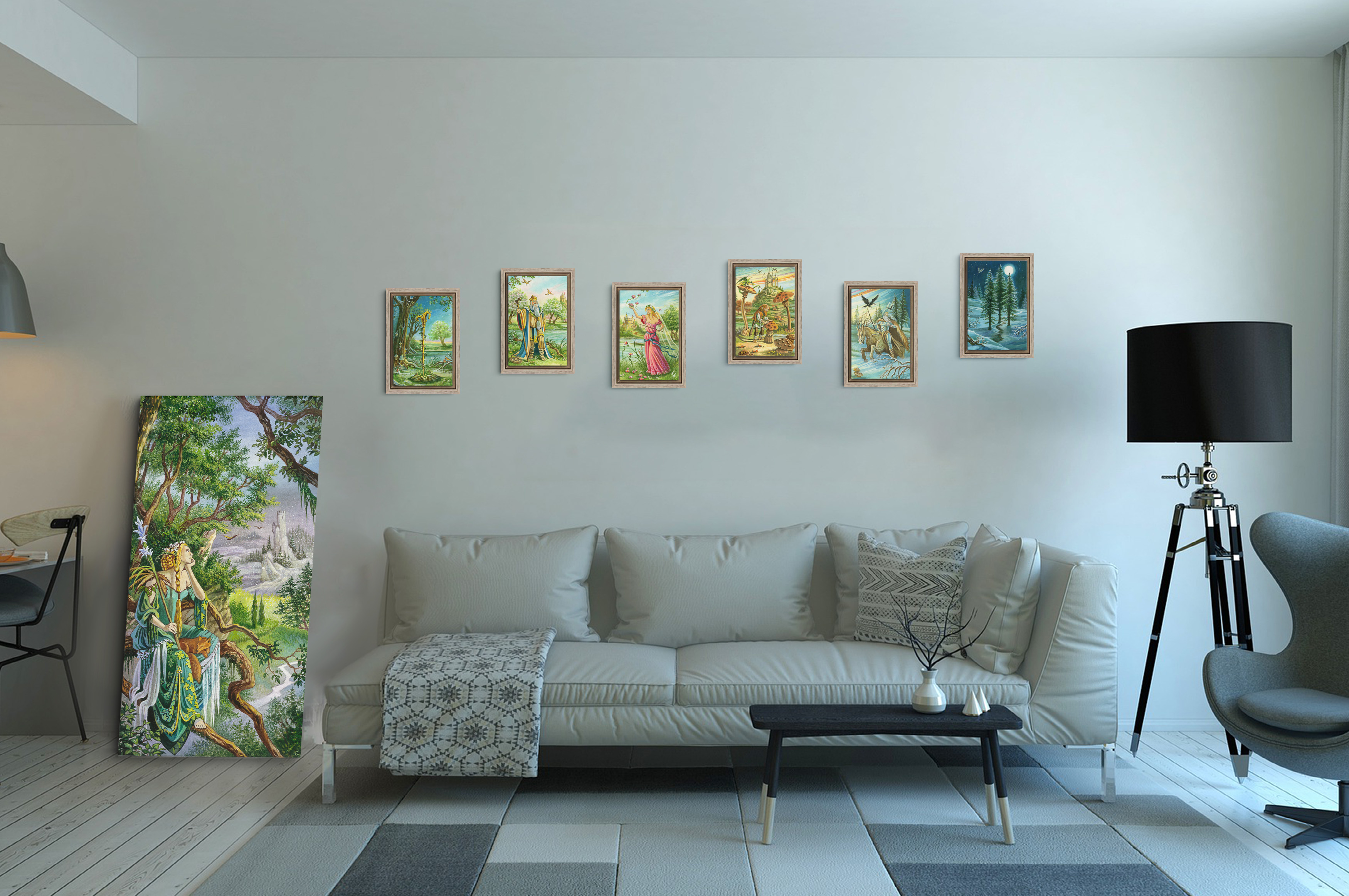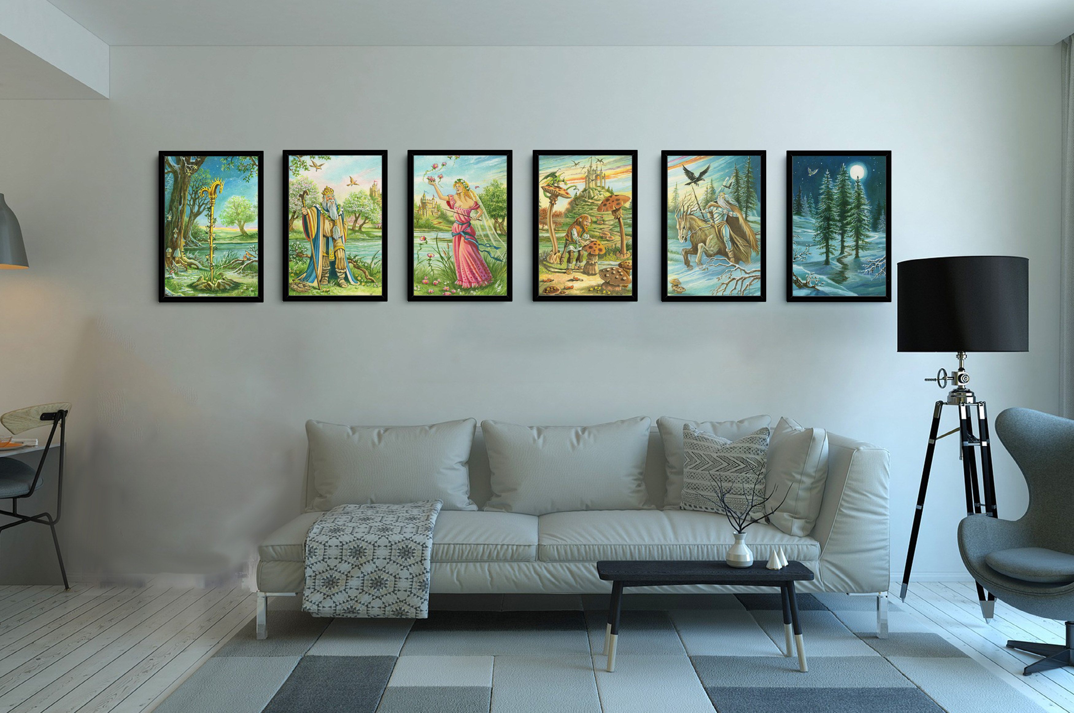 Présentation de toute la série des Bâtons du Labyrinthe en format S (A4) avec cadre chêne