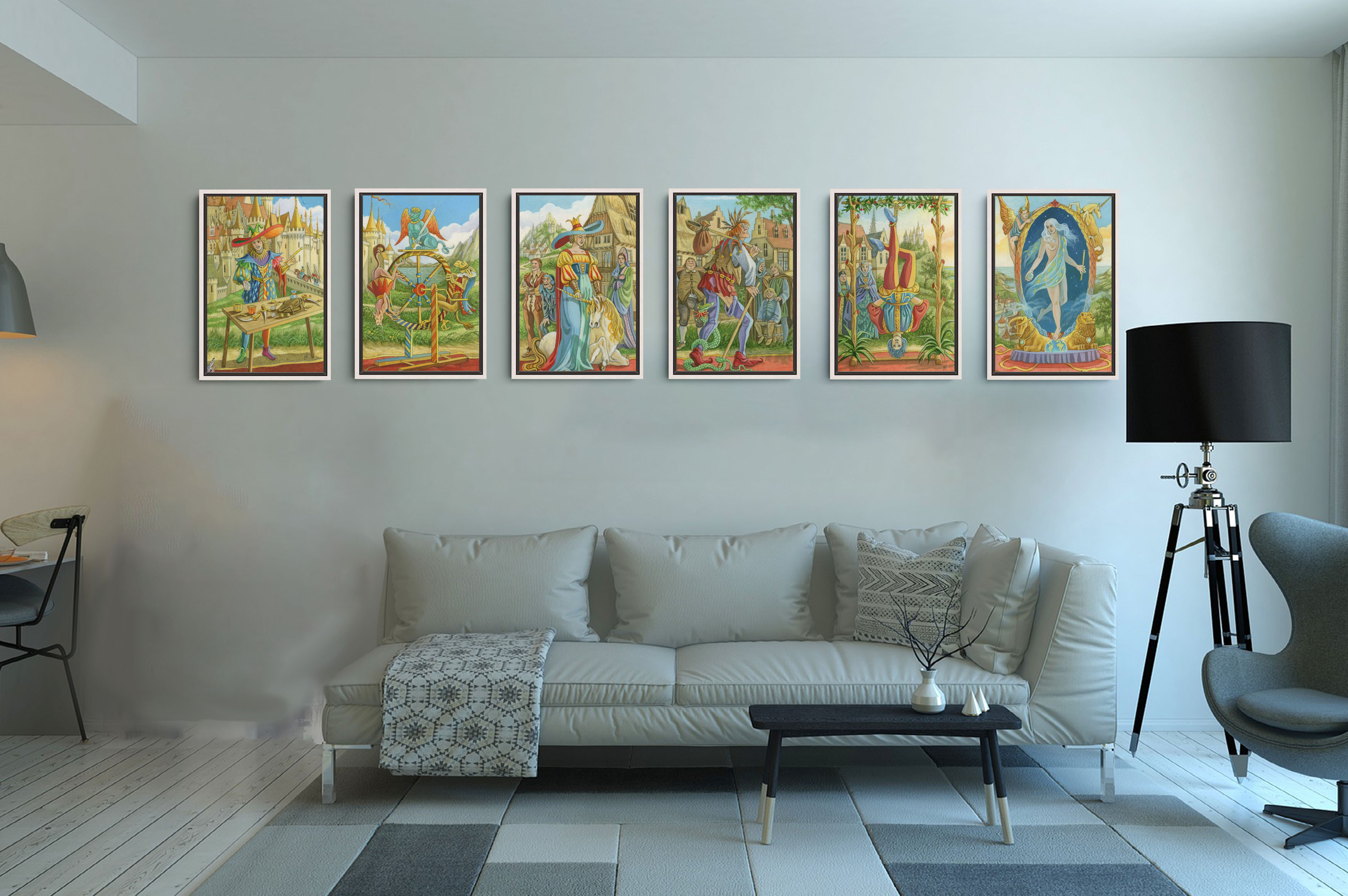 Présentation de toute la série des Arcanes majeurs de la Marelle en format L (A2) avec cadre argent
