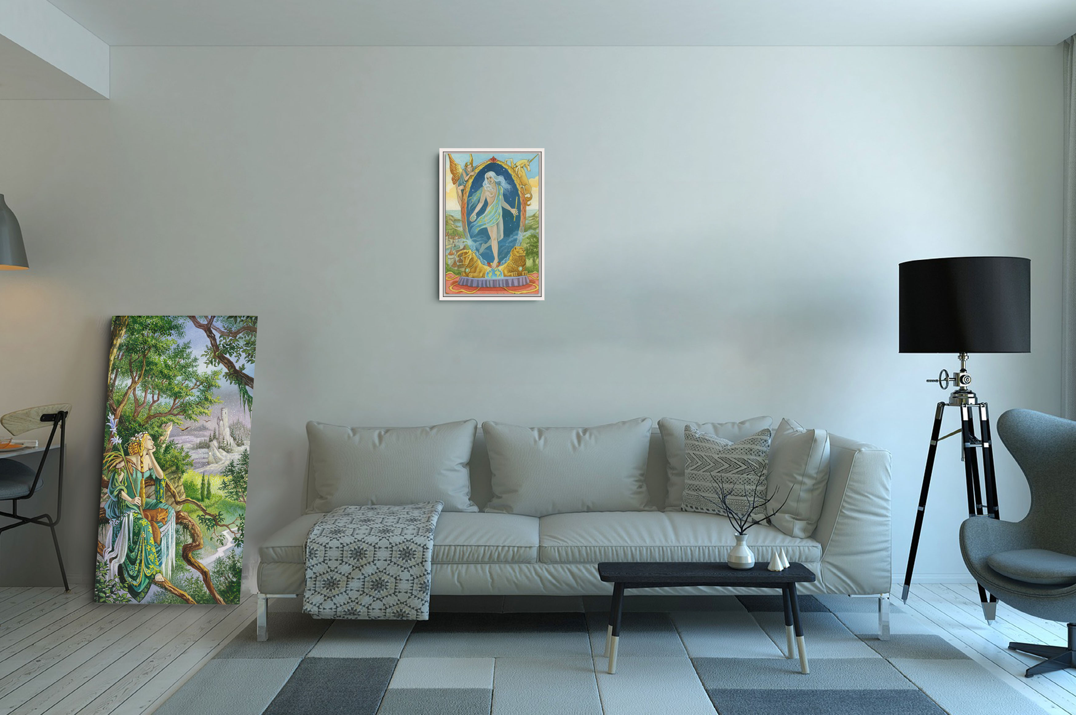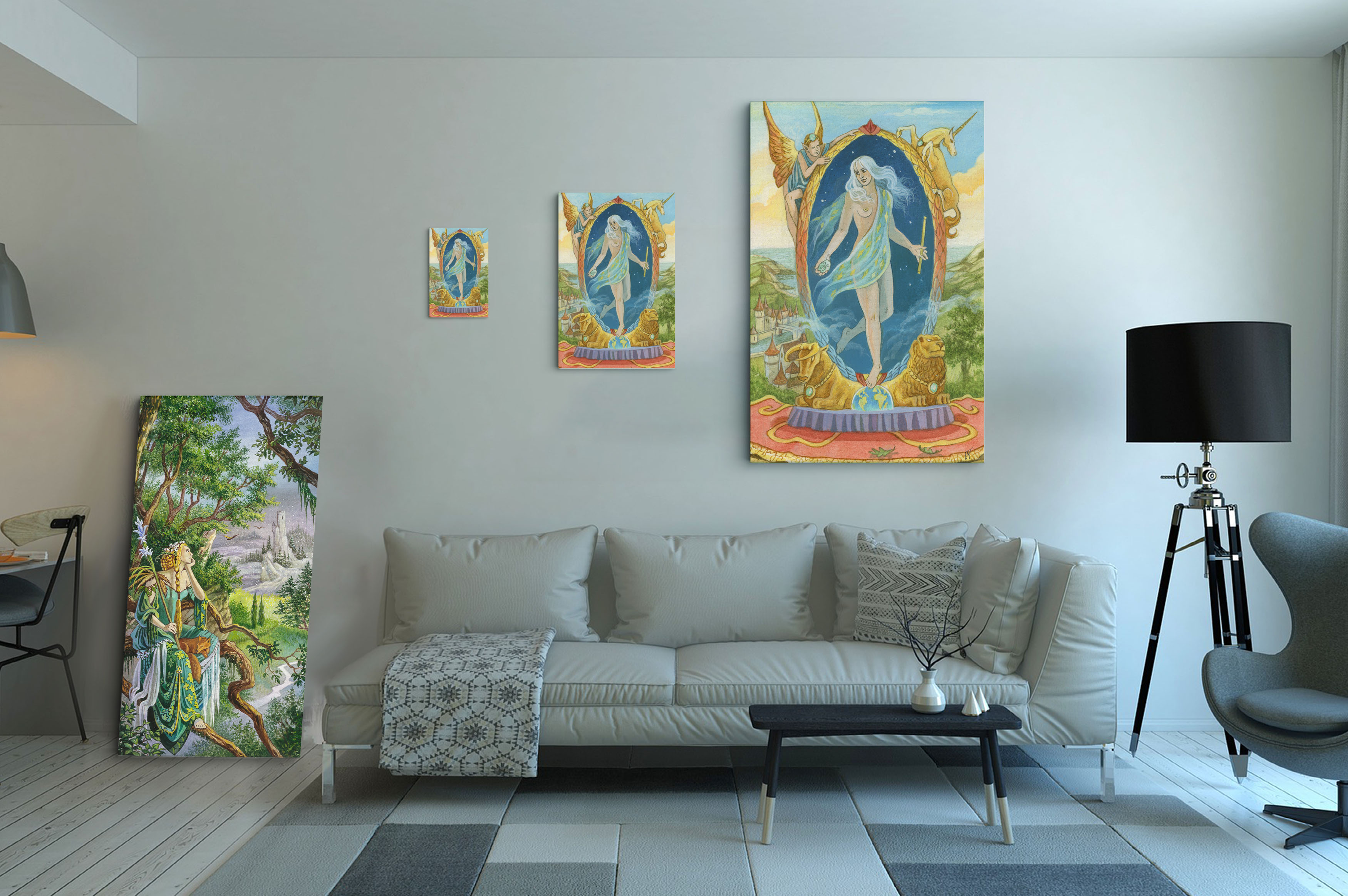 Les toiles présentées au-dessus du canapé ont un encadrement blanc et argent pour la taille S et L, et noir pour la taille XXL.