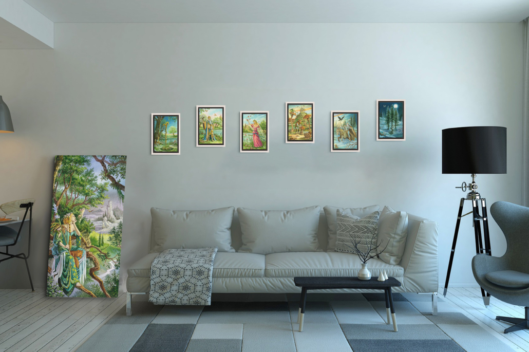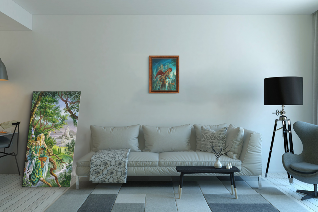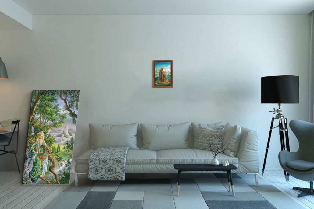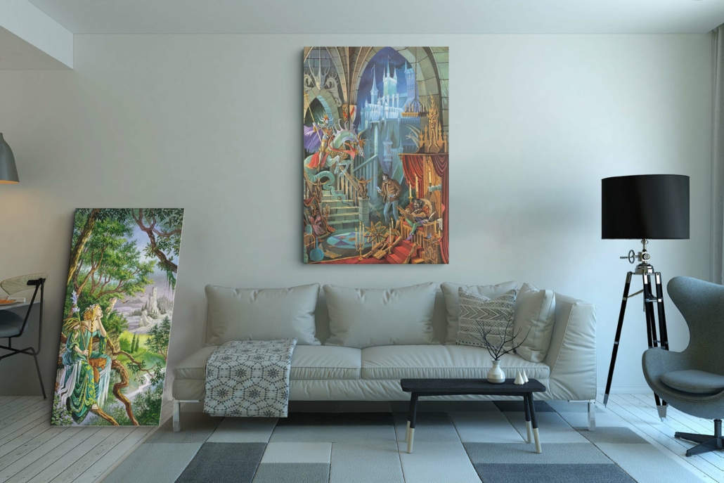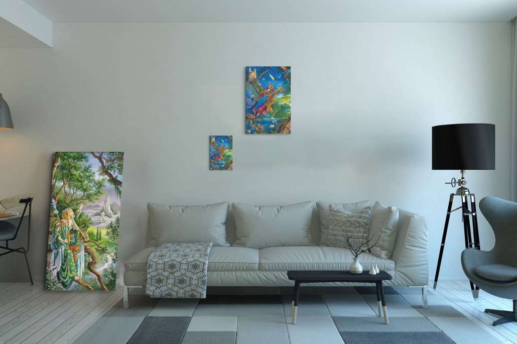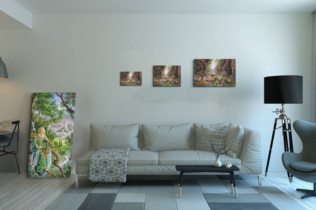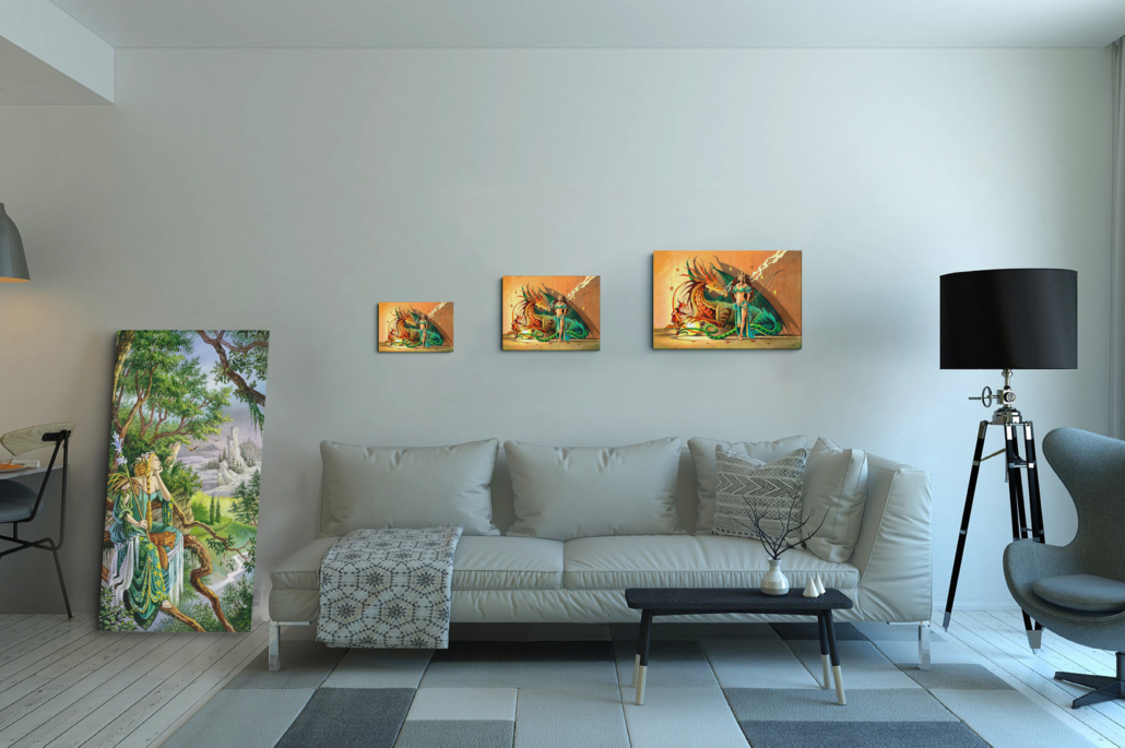 (Cliquez sur les images pour les agrandir. Sur les photos d’aménagement intérieur, la toile posée à gauche du canapée, est La Dame verte en format XXL.)