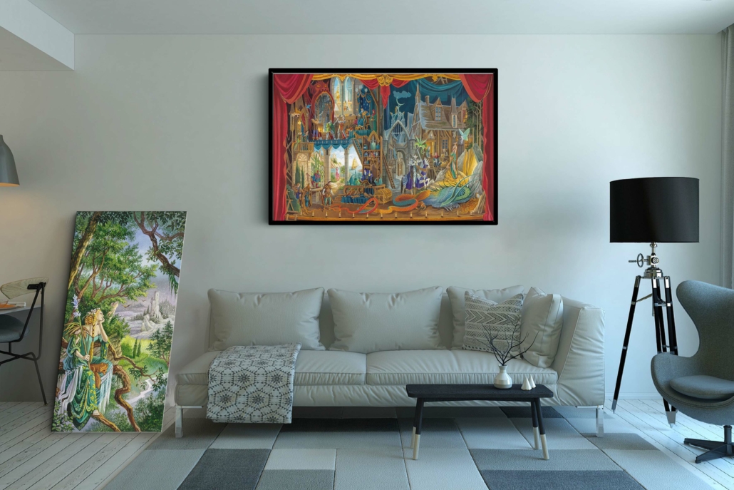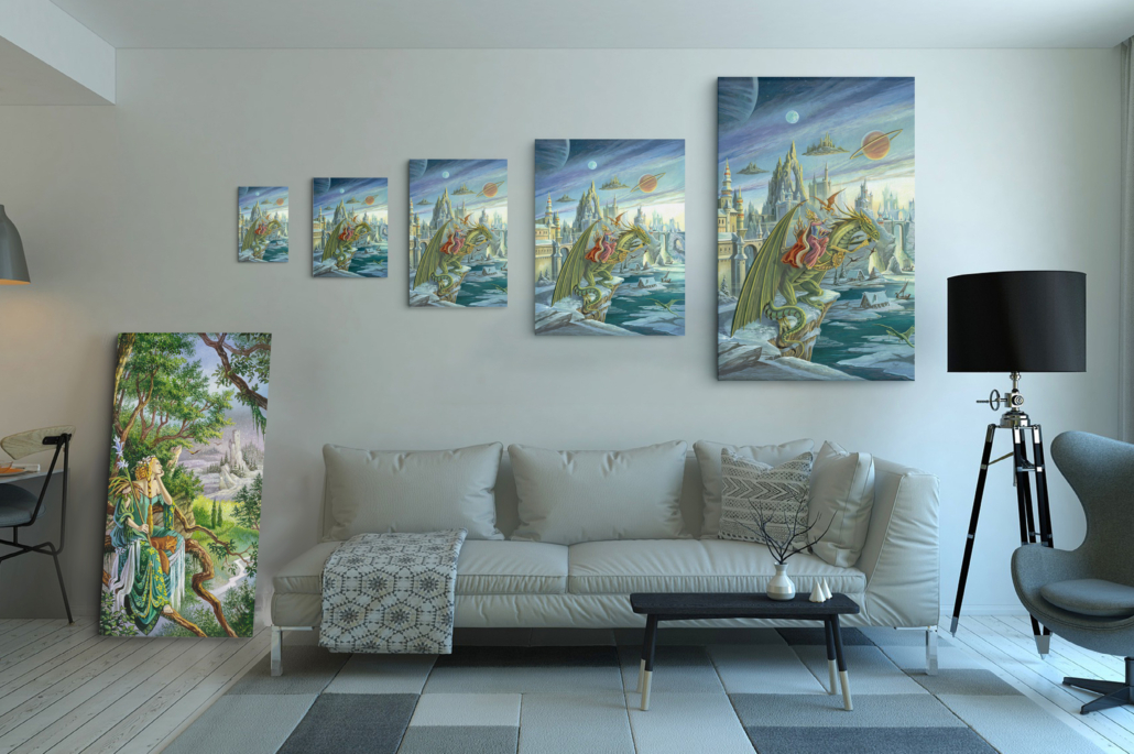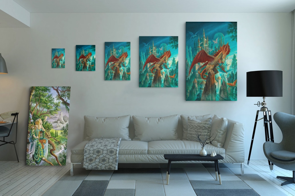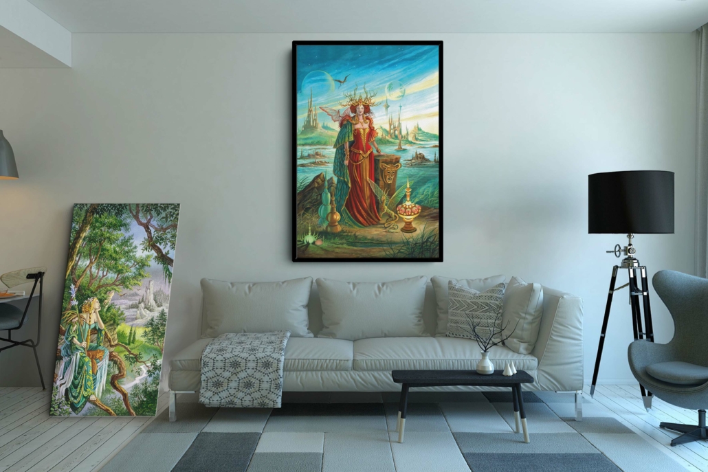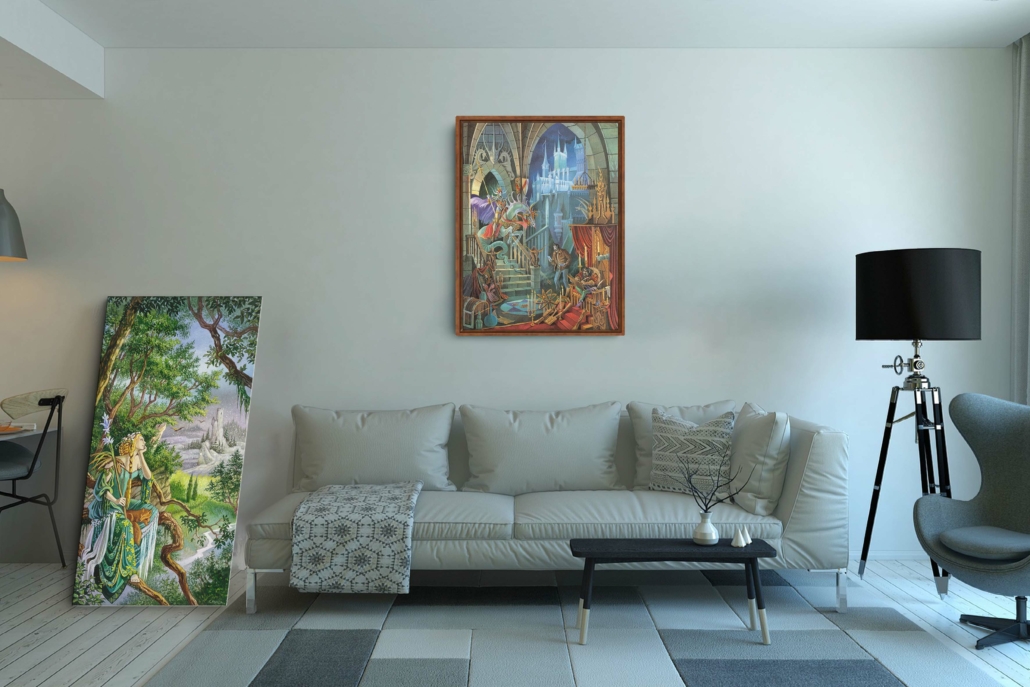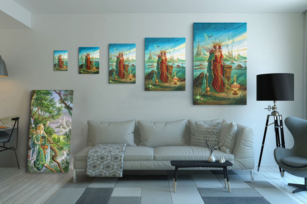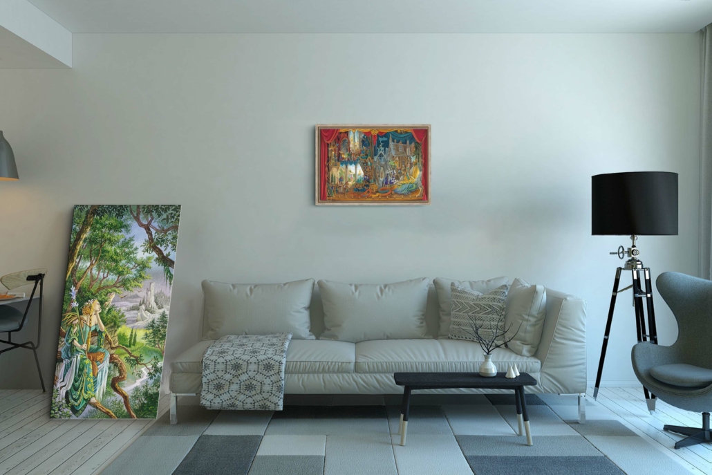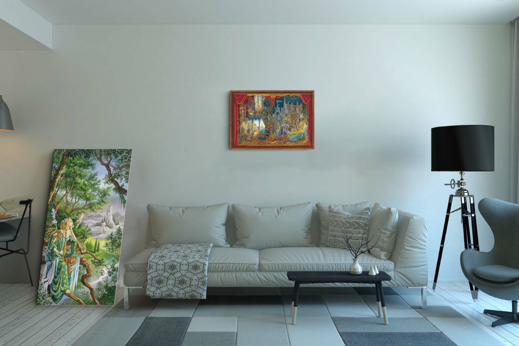 (Cliquez sur les images pour les agrandir. Sur les photos d’aménagement intérieur, la toile posée à gauche du canapée, est La Dame verte en format XXL.)